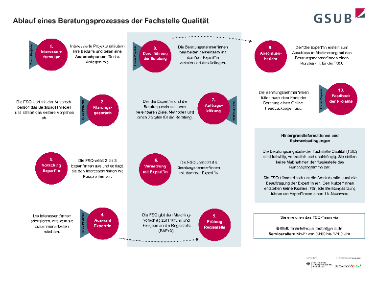 Eine erklärende Übersicht zu den vorgenannten Beratungsformaten finden Sie hier. Die Veranstaltungs- und Beratungsformate werden mit Ausnahme der Projektmanage-ment-Fachberatung und der Initialberatung Qualitätsentwicklung PB Bund durch 34 qualifizierte Expert*innen aus dem ganzen Bundesgebiert umgesetzt. Das Matching zwischen Anfragenden und Pool-Mitgliedern übernimmt die Fachstelle.